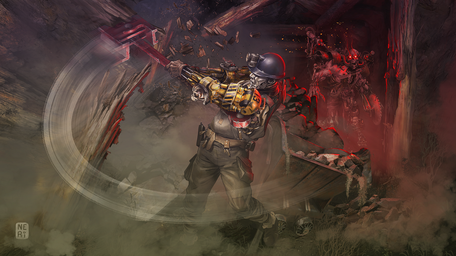 I was involved from the briefing stage, proposing changes that made the scene more cinematic and intense. To emphasize Mine’s presence, I placed him mid-action with his hammer, turning the collapsing mine behind him into a core storytelling element rather than just a backdrop.